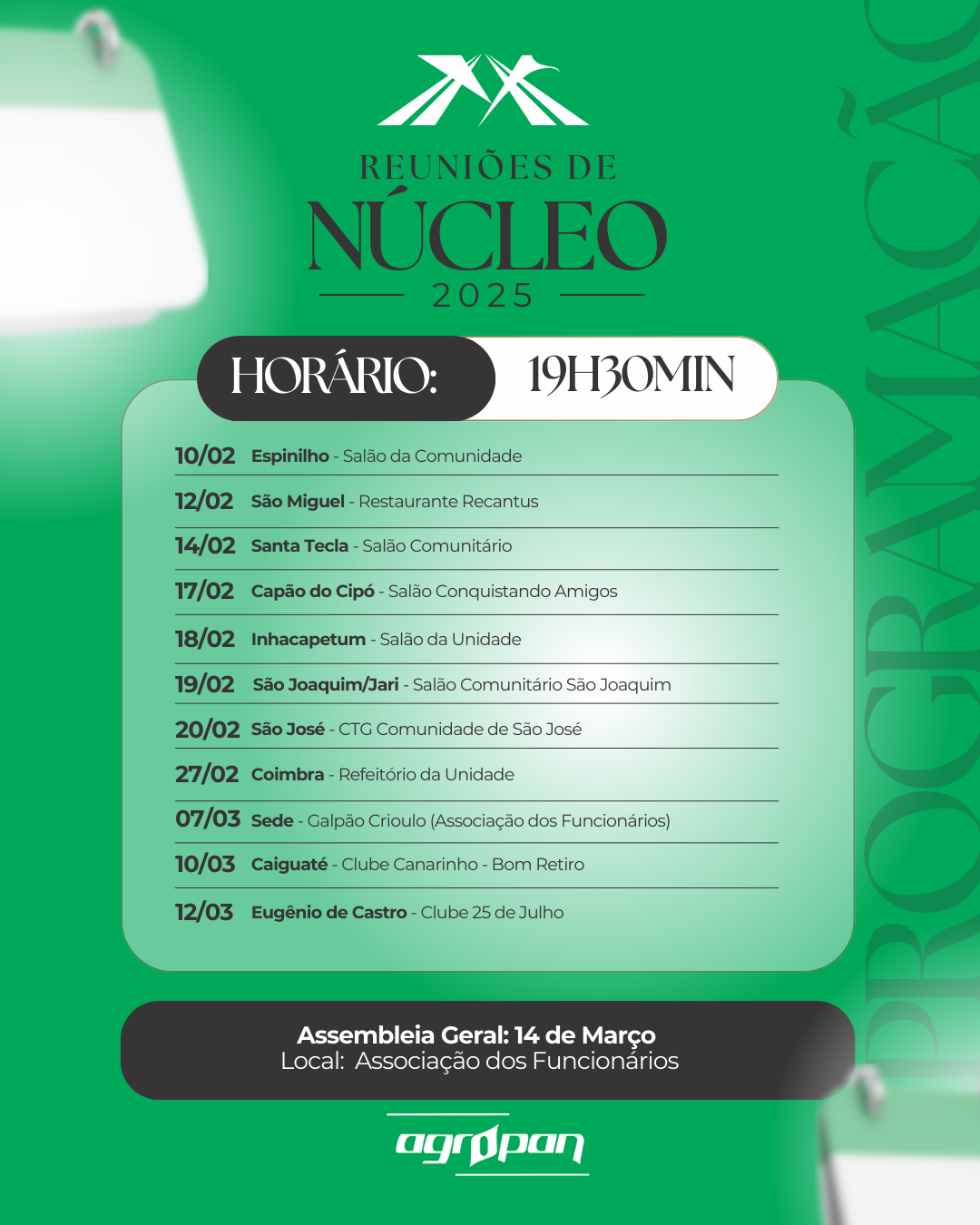 As reuniões de núcleo são momentos essenciais para fortalecer a participação e o desenvolvimento da nossa cooperativa. Confere as datas e locais e vem contribuir com o futuro da Agropan!